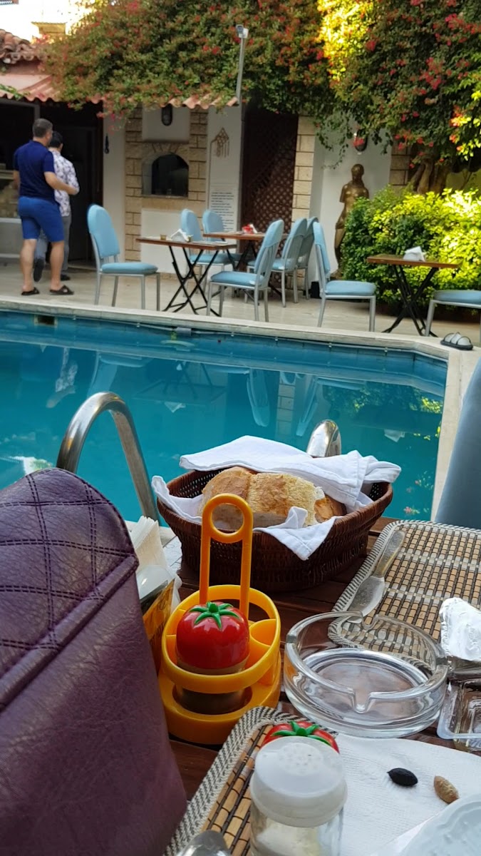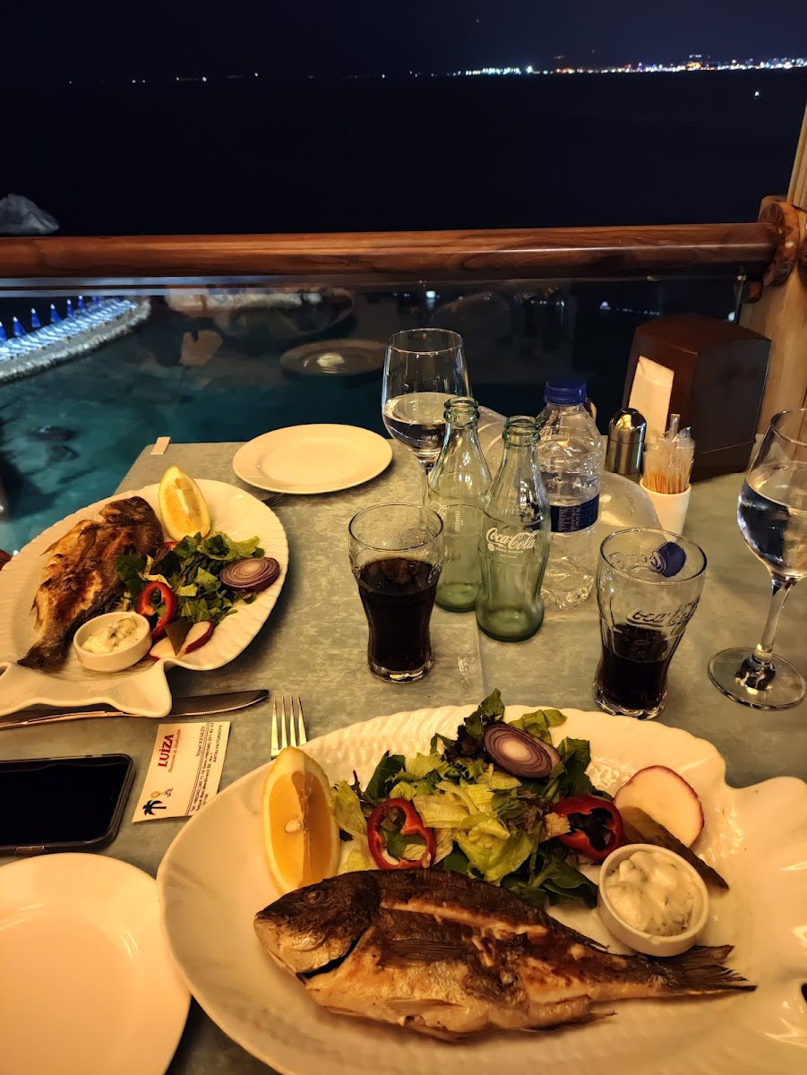 My wife and I were greeted near the entrance by the waiter was polite, courteous, well presented, but casual. We were offered a table of our choosing; we sat outside in the veranda which offered amazing views of the harbour, the mountain range in the distance, and the ocean. These views were matched by the quality of the food. I had the chicken salad, my wife had calamari, which was cooked perfectly. so much so, that my wife didn't give me a chance to photograph the meal.... so the gap on the plate was also calamari (see photo). a very generous portion. If you're in the area, this eatery is worth a visit. I also had a large bottle of water and my wife had a lager. Total cost 162 lira (£10)
